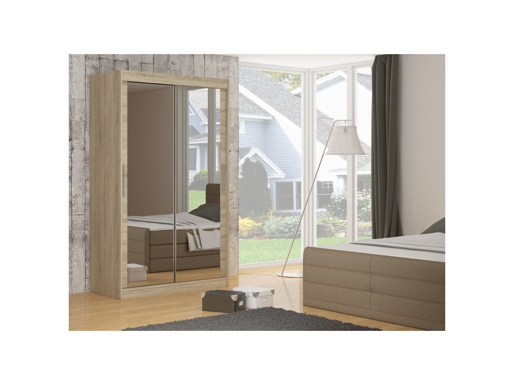 Moderní šatní skříň Ettore se zrcadlem. Skříň má posuvné dveře,dvoudveřové.