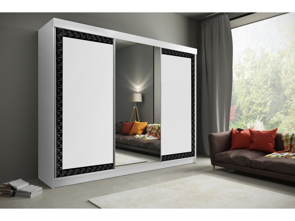 Luxusní šatní skříň Rumba se zrcadlem s ozdobným černým dekorem a posuvnými dveřmi.