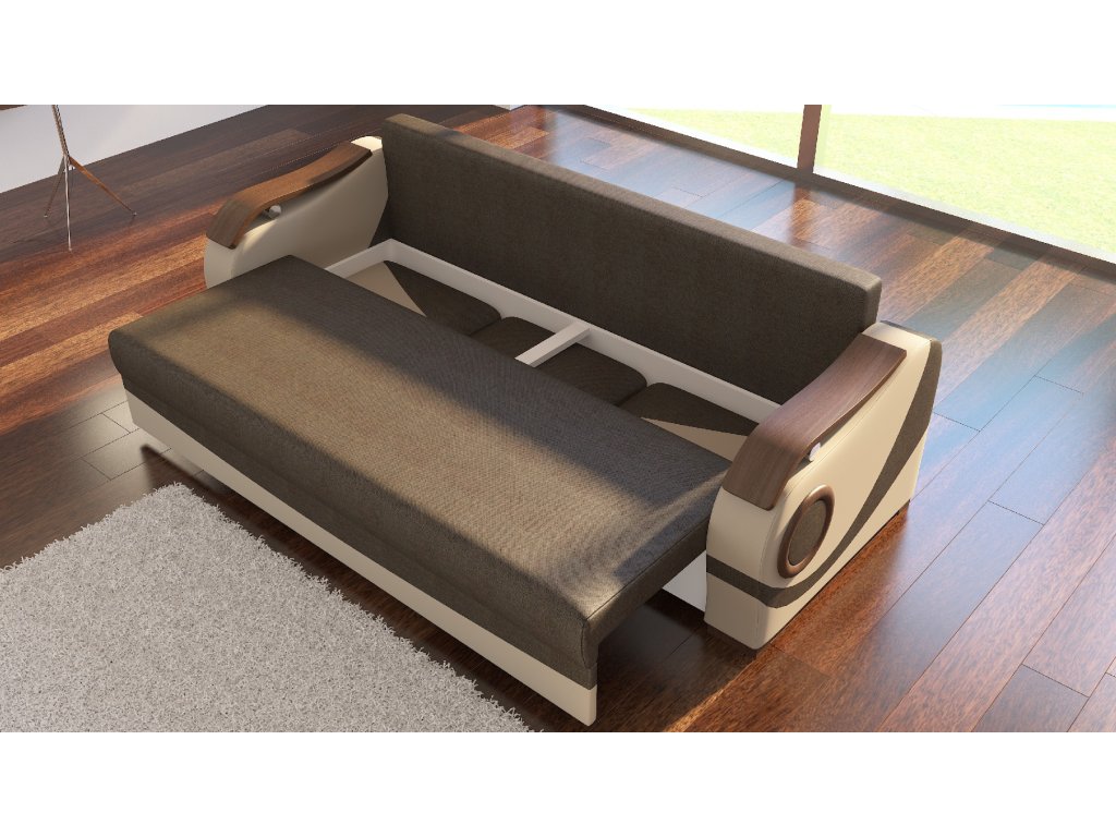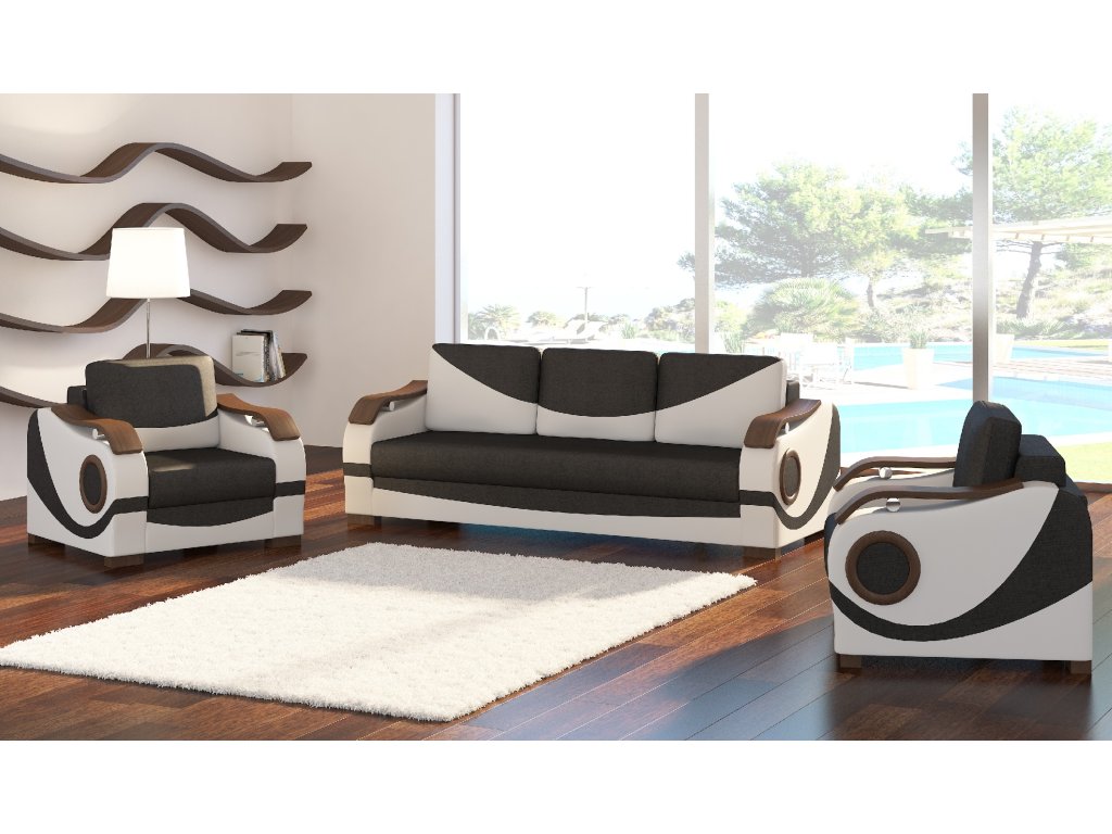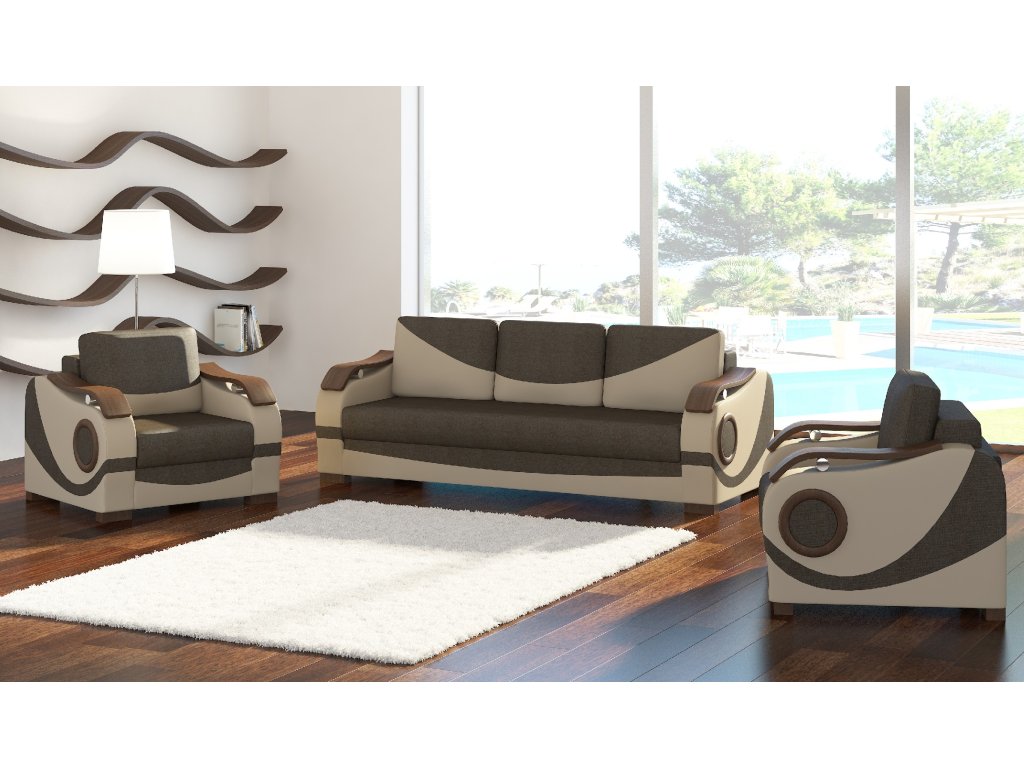 Moderní Sedací souprava Puerto 3+1+1 se skládá z 1 pohovky a 2 křesel. Pohovka se dá rozložit, čímž vznikne spací plocha pro příležitostné spaní a uvnitř najdete úložný prostor.